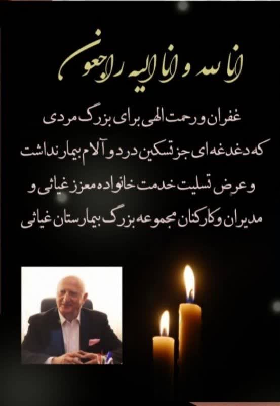 با نهایت تأسف و تاثر ، جناب آقای مهندس ابوالفضل غیاثی از خیرین نیکاندیش کشور دار فانی را وداع گفت.بیتردید خدمات ارزشمند و ماندگار ایشان در حوزه سلامت و امور خیریه، همواره در یاد و خاطر مردم قدرشناس باقی خواهد ماند. همکاران و پرسنل بیمارستان خیریه غیاثی، ضمن عرض تسلیت صمیمانه به خانواده محترم آن […]